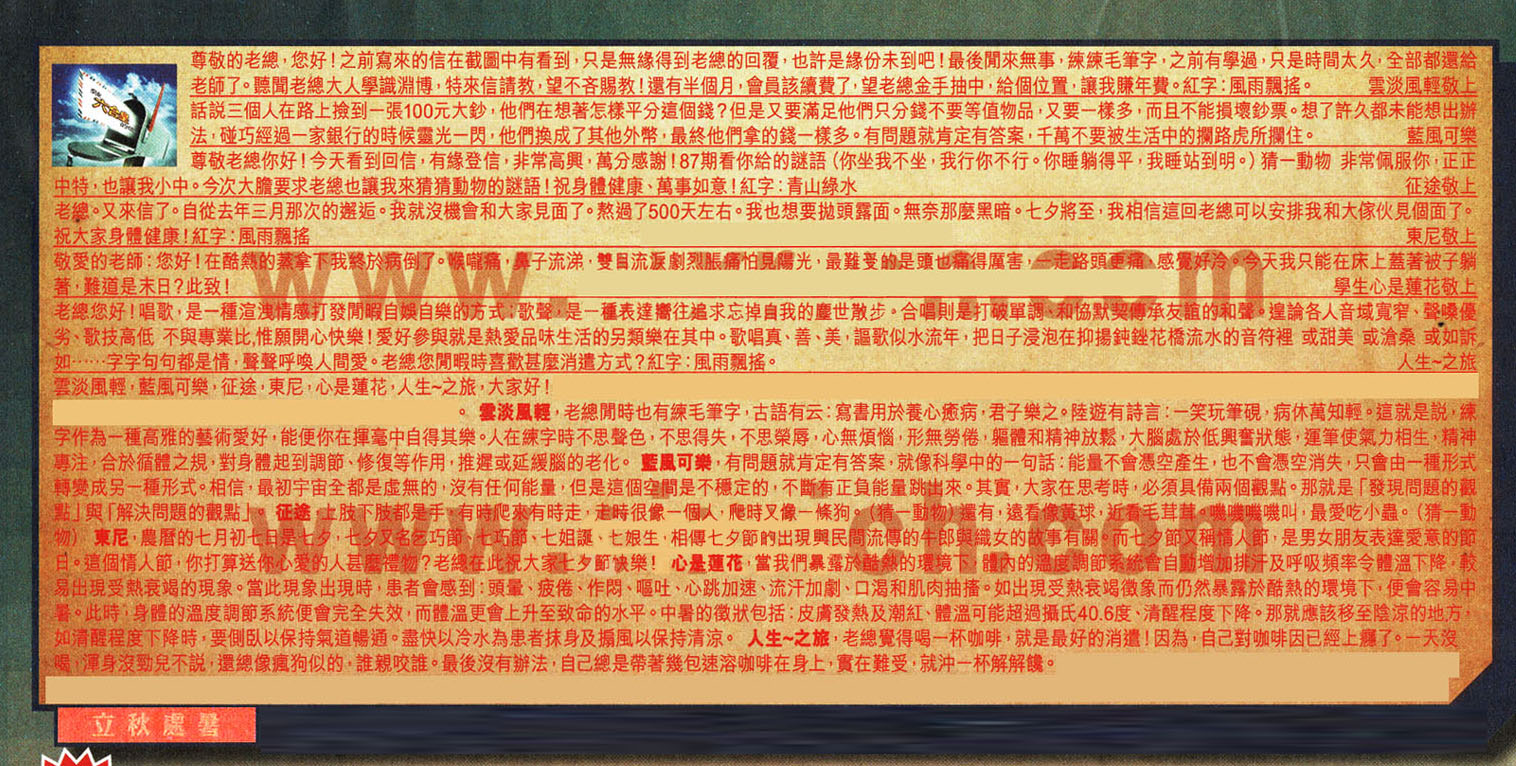 【4】老總。又來信了。自從去年三月那次的邂逅。我就沒機會和大家見面了。熬過了500天左右。我也想要拋頭露面。無奈那麼黑暗。七夕將至,我相信這回老總可以安排我和大像伙見個面了。祝大家身體健康!紅字:風雨飘搖---東尼敬上