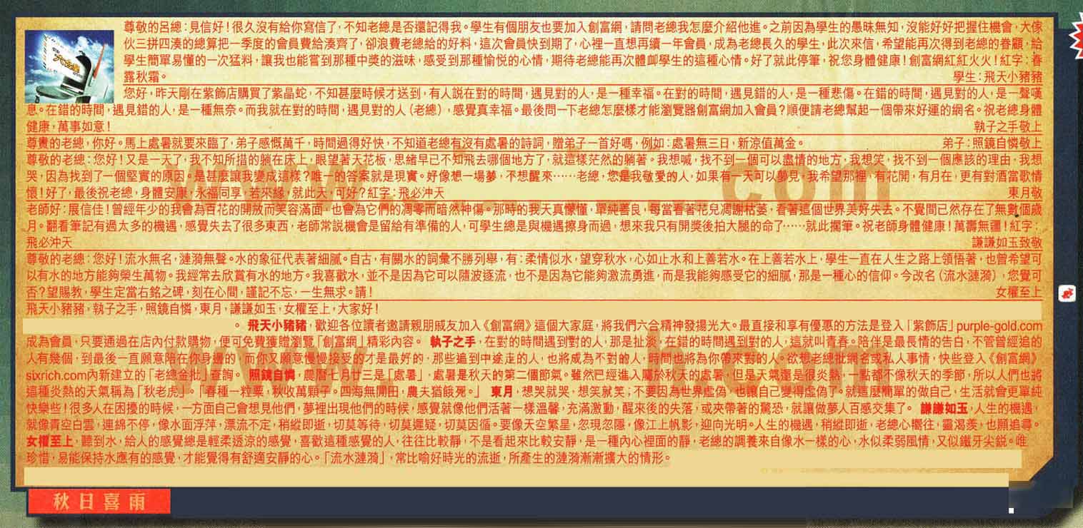 【1】尊敬的呂總:見信好!很久沒有給你寫信了,不知老總是否還記得我。學生有個朋友也要加入創富網,請問老總我怎麼介紹他進。之前因為學生的愚昧無知,沒能好好把握住機會,大傢伙三拼四凑的總算把一季度的會員費給湊齊了,卻浪费老總給的好料,這次會員快到期了,心裡一直想再續一年會員,成為老總長久的學生,此次來信,希望能再次得到老總的眷顧,給學生簡單易懂的一次猛料,讓我也能嘗到那種中獎的滋味,感受到那種愉悦的心情,期待老總能再次體卸學生的這種心情。好了就此停筆,祝您身體健康!創富網紅紅火火!紅字:春露秋霜。--- 學生:飛天小豬豬