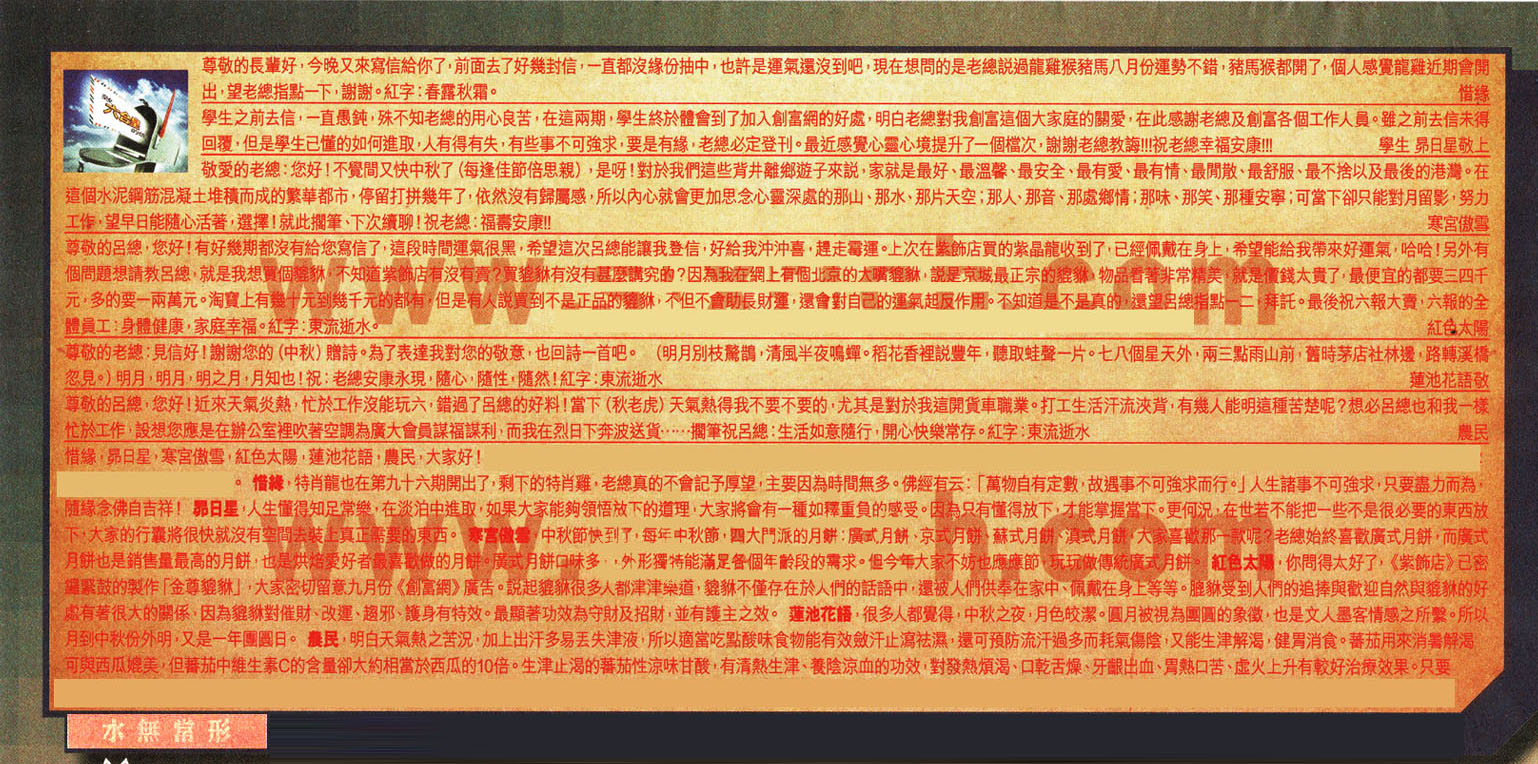 【6】尊敬的呂總,您好!近來天氣炎熱, 忙於工作沒能玩六,错過了呂總的好料!當下 (秋老虎)天氣熱得我不要不要的,尤其是對於我這開貨車職業。打工生活汗流浹背 ,有幾人能明這種苦楚呢?想必呂總也和我一樣忙於工作,設想您應是在辦公室裡吹著空調為廣大會員謀福謀利 而我在烈日下奔波送货.....擱筆祝呂總:生活如意随行,開心快樂常存。紅字:東流逝水 --- 農民